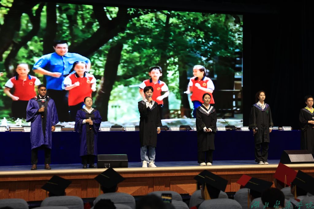 典礼伊始,暖场歌曲串烧《青春满怀高歌起航》点燃全场师生热情。毕业生代表倾情演唱《纪念》《不要慌太阳下山有月光》《不说再见》《第一天》《青春探路者》等经典曲目,悠扬的旋律和背景屏同步播放的校园生活影像,唤起了大家对大学生活的不舍与留恋。毕业班辅导员合唱《光阴的故事》,并送出真挚而温情的祝福,让现场毕业生热泪盈眶,掌声不断。