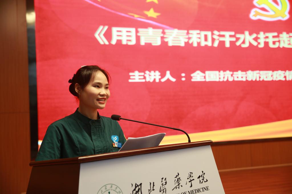 大会邀请了全国抗击新冠肺炎疫情先进个人,附属人民医院急诊EICU护士长,我校2011届校友郭文萍同志讲述抗疫故事《用生命和汗水托起了生命的希望》,郭文萍于1月23日第一批驰援武汉金银潭医院,在抗疫一线每天工作12小时,坚持战斗33天,直面危险挑战,以生命守护生命,面对一名因缺氧而即将呼吸心跳䠫停65岁的重症患者,她凭着10年急诊护理工作经验和对专业的足够自信,还来不及带上动力新风装备,我就毫不犹豫地站出来说“你们配合,我来,我会”,她回忆“在武汉金银潭医院六楼病区,有86名支援人员,其中湖北医药学院校友有59名,我工作的小组一共6人,就有5名是湖北医药学院校友,当时一提到母校,洋溢在我们脸上的是骄傲和自豪”.....作为党员,郭文萍“我将无我,不负人民”的选择和“坚持到底、舍我取谁”的勇敢令在场每一位师生都无比感动,她用忠诚践行了她在党旗下的铮铮誓言,用担当诠释了白衣天使的救死扶伤的崇高精神。