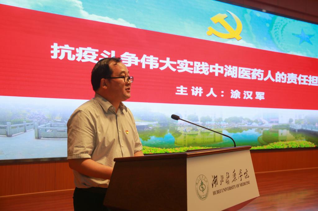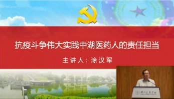 涂汉军以《抗疫斗争伟大实践中湖医药人的责任担当》为题讲授抗疫微党课。党课从“党旗就是方向,绷紧防控弦筑牢校园防控屏障”“疫情就是命令,坚持生命至上守护人民健康”“防控就是责任,奋力夺取疫情防控和事业发展“双胜利”等三个方面,总结了筑牢校园防控体系取得的成果;讲述了各附属医院医务人员、全国各地校友、广大青年学生在抗疫斗争中的担当作为和感人事迹;并对下一步抓好常态化疫情防控提出了要求和措施。