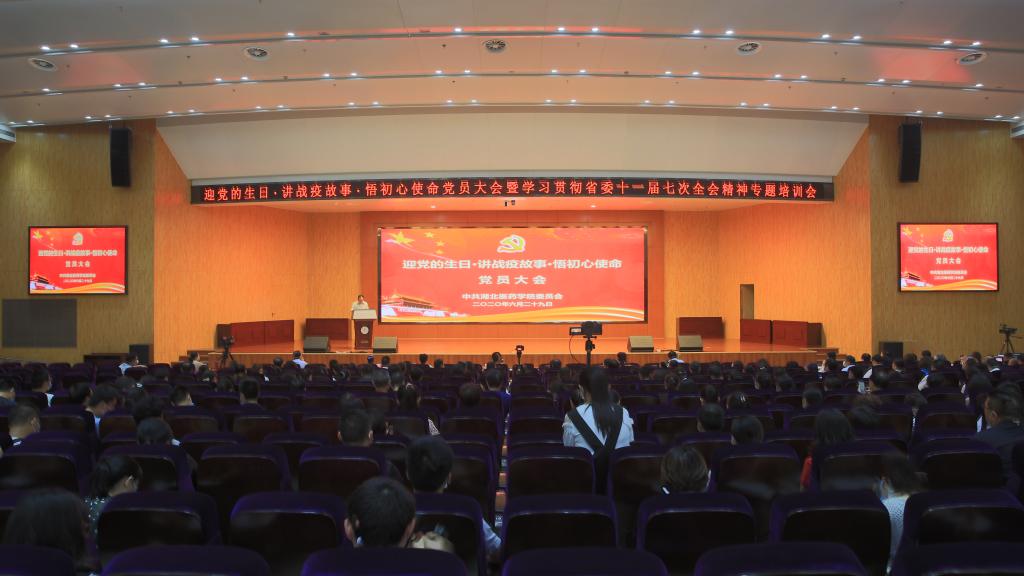 本网讯(通讯员 郭震宁)6月29日下午,湖北医药学院召开“迎党的生日·讲战疫故事·悟初心使命”党员大会。全体在校校领导,党支部书记、副科级以上领导干部,党员代表现场参会,7000余名党员、师生线上同步学习,会议由党委书记涂汉军主持。
