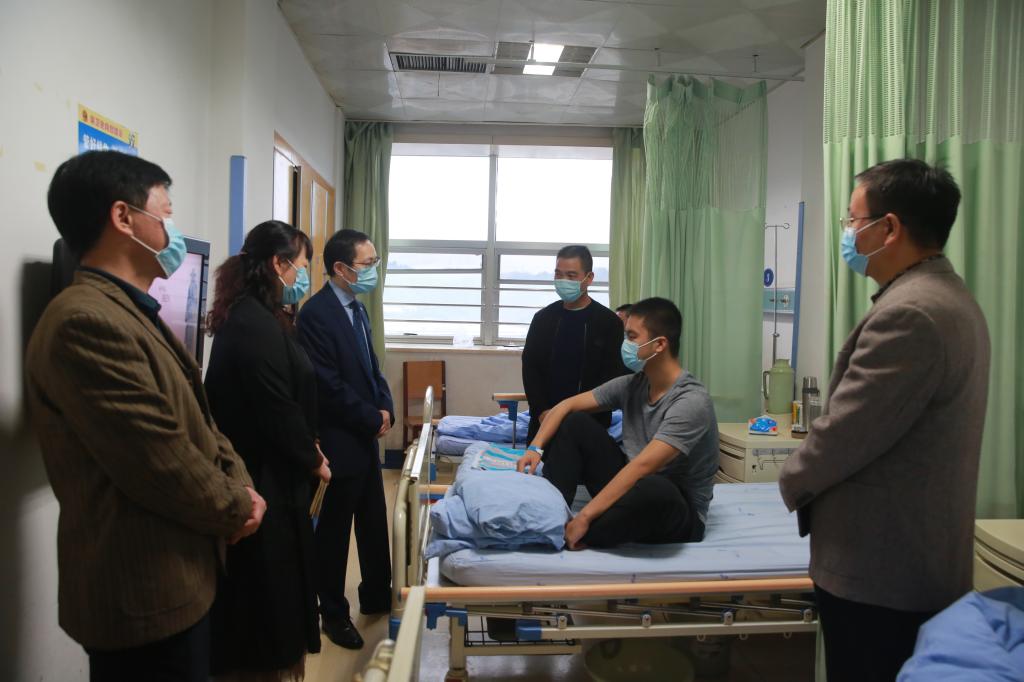 10月10日下午,湖北医药学院党委常委、副校长李涛带领学工处处长陈建龙,口腔医学院书记许珊,副书记秦赤子及教师、学生代表前往附属太和医院,看望慰问正在住院治疗的口腔医学院2020级口腔1班新生陈亮。