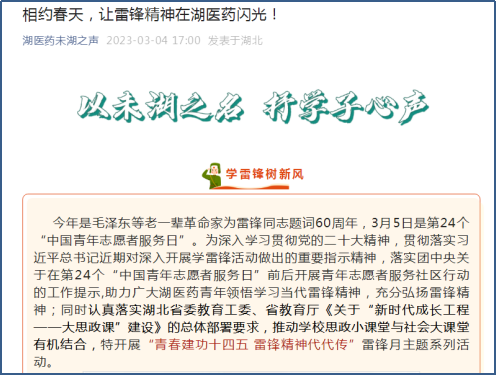在“雷锋日”到来前夕,湖北医药学院向广大师生发出《相约春天,让雷锋精神在湖医药闪光!》的号召。
