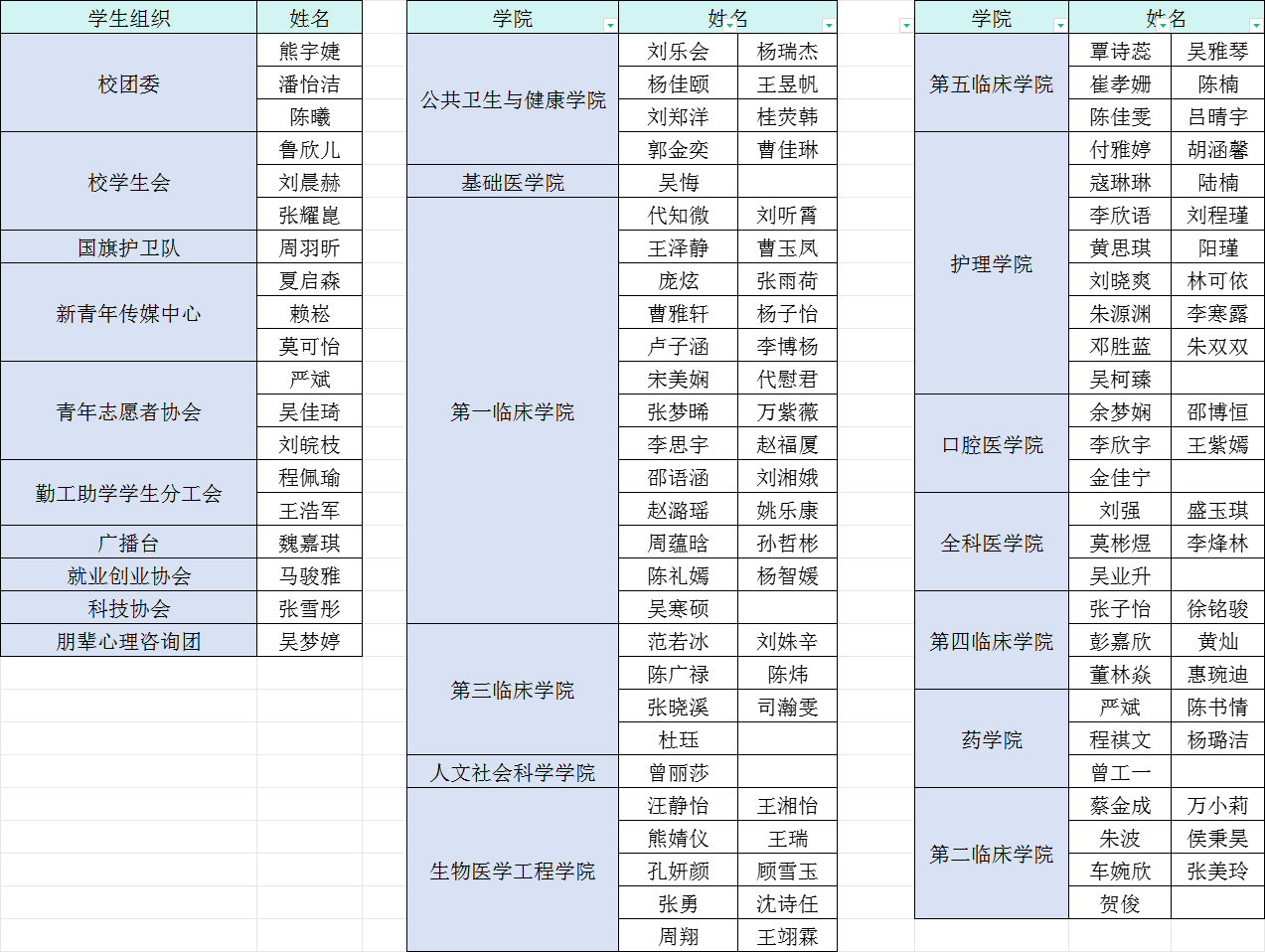 根据《关于遴选湖北医药学院、湖北医药学院药护学院2025年青马工程培训班学员的通知》要求,由校团委主导,校院学生会配合,遴选出2025年青马工程培训班预备学员120名(包括学生组织人员19名,学院人员101名),名单如下表: