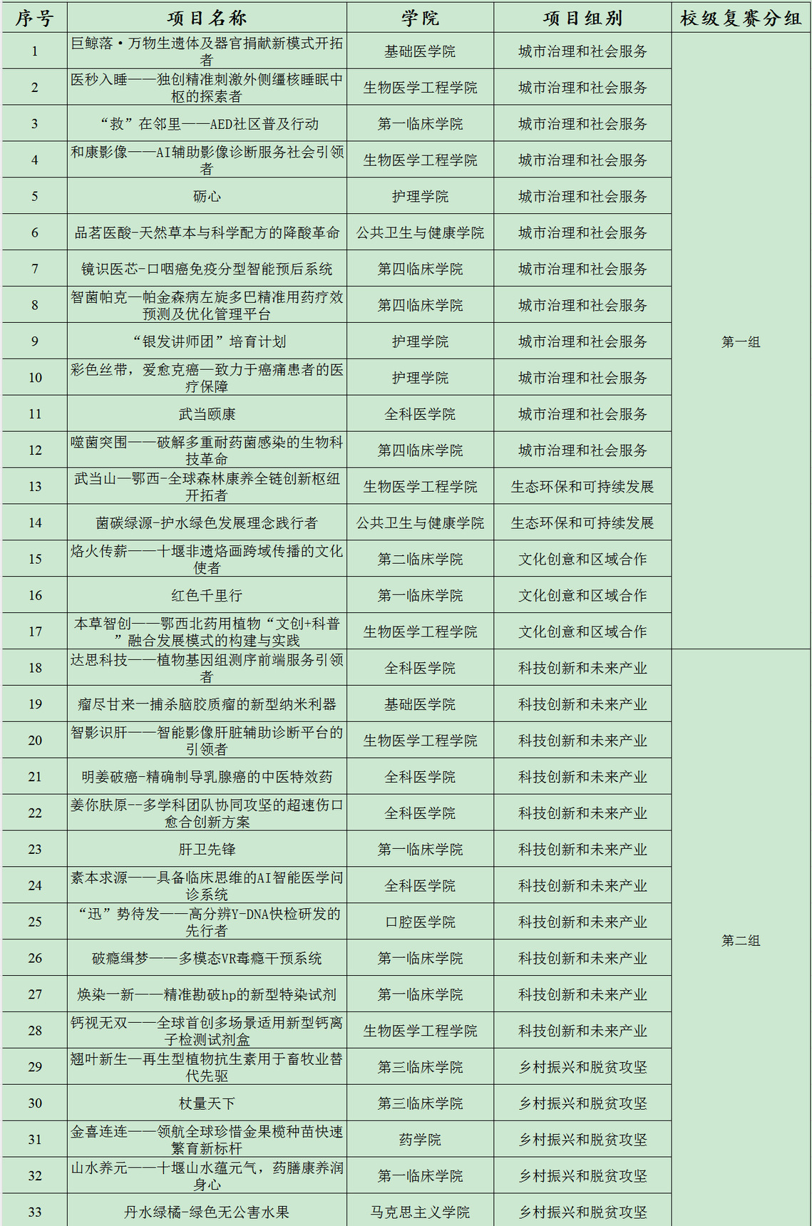 现对进入复赛的项目名单及复赛分组进行公示: