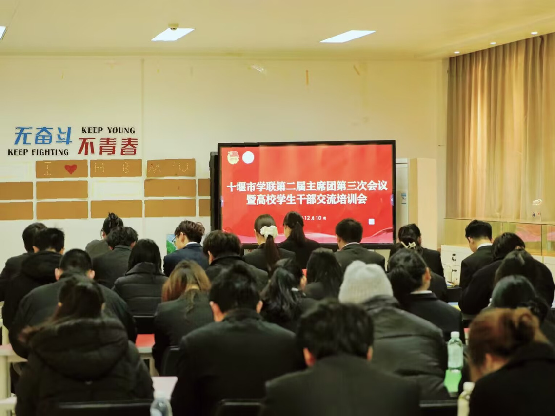 本网讯(通讯员 蔡姝琳 张彬彬)12月10日上午,十堰市学联第二届主席团第三次会议暨高校学生干部交流培训会在我校召开。团市委曾媛、肖玉莹,湖北医药学院思政4S团青年讲师代表郭俊、孙淑伟,市学联主席团成员、各高校学生会主席团成员及部长代表参加活动。
